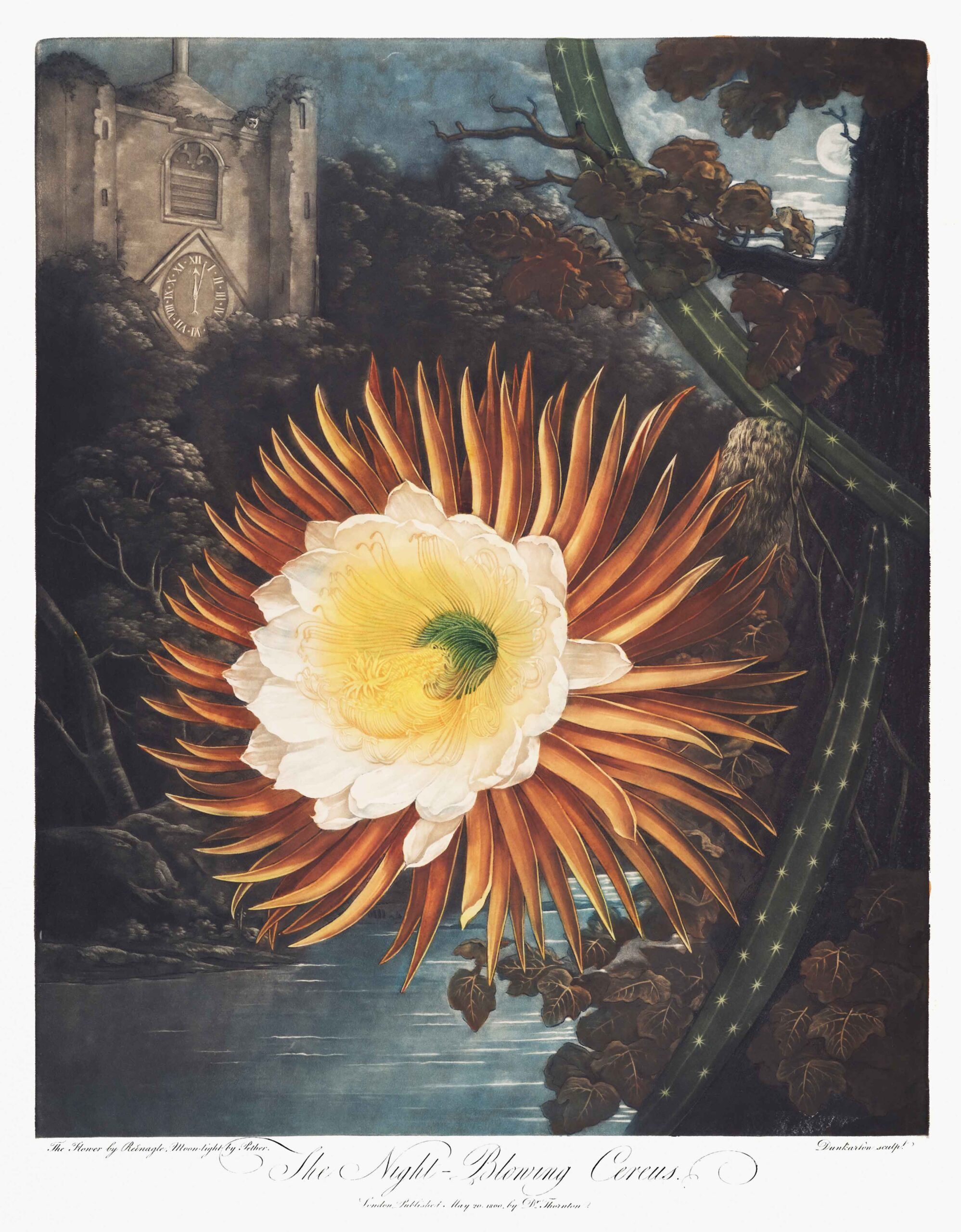 A reproduction from Robert John Thornton’s “The Temple of Flora.” These images depict flowers in epic and unusual settings. Interwoven amongst the images are various descriptions, histories and poetic odes regarding the flowers featured. The first plates were engraved by Thomas Medland in May 1798 from paintings by Philip Reinagle. Between 1798 and 1807 they produced a total of thirty-three colored plates, engraved in aquatint, stipple and line. Others engravers included Joseph Constantine Stadler working from the painting of Peter Charles Henderson.