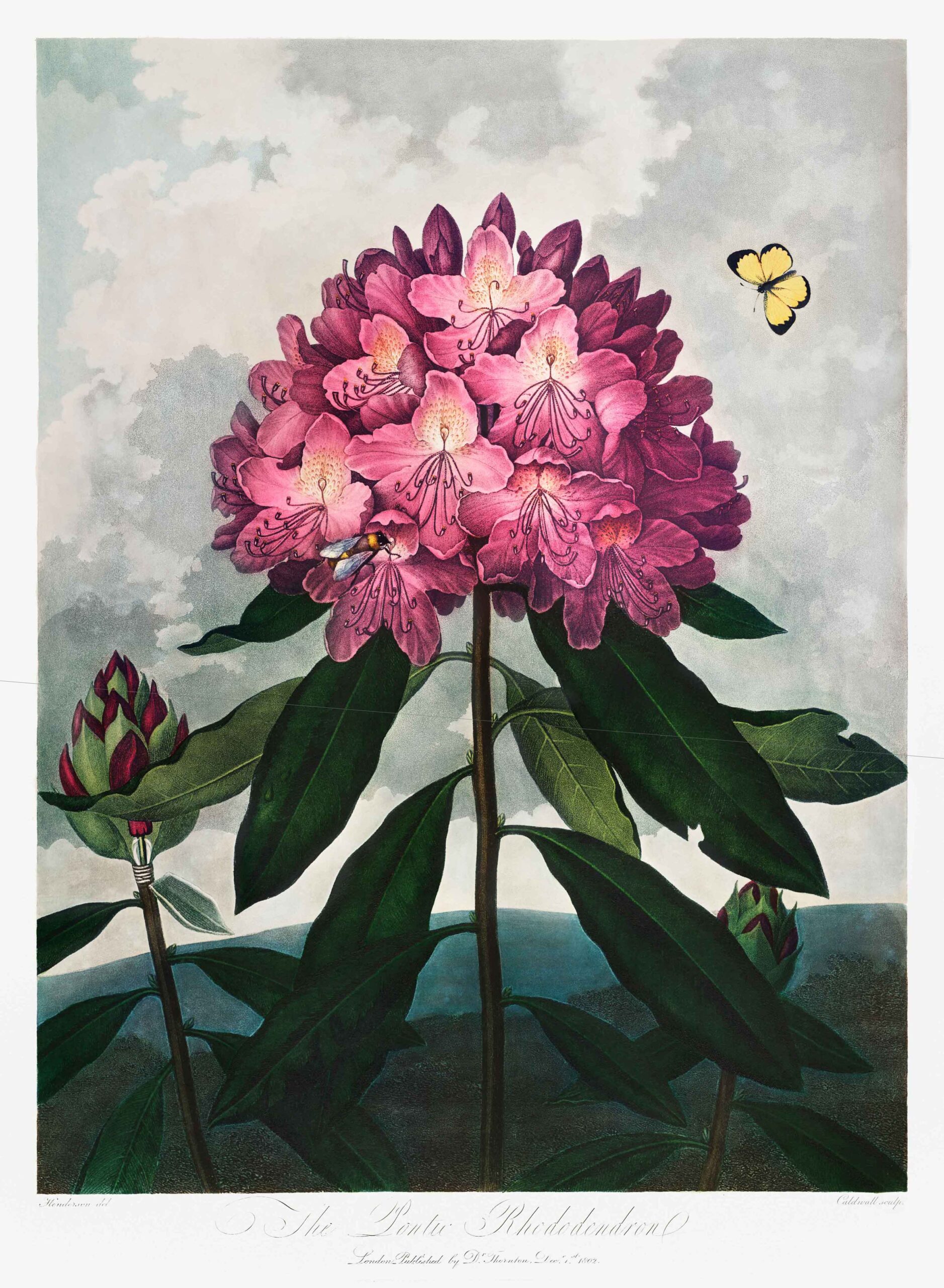 A reproduction from Robert John Thornton’s “The Temple of Flora.” These images depict flowers in epic and unusual settings. Interwoven amongst the images are various descriptions, histories and poetic odes regarding the flowers featured. The first plates were engraved by Thomas Medland in May 1798 from paintings by Philip Reinagle. Between 1798 and 1807 they produced a total of thirty-three colored plates, engraved in aquatint, stipple and line. Others engravers included Joseph Constantine Stadler working from the painting of Peter Charles Henderson.