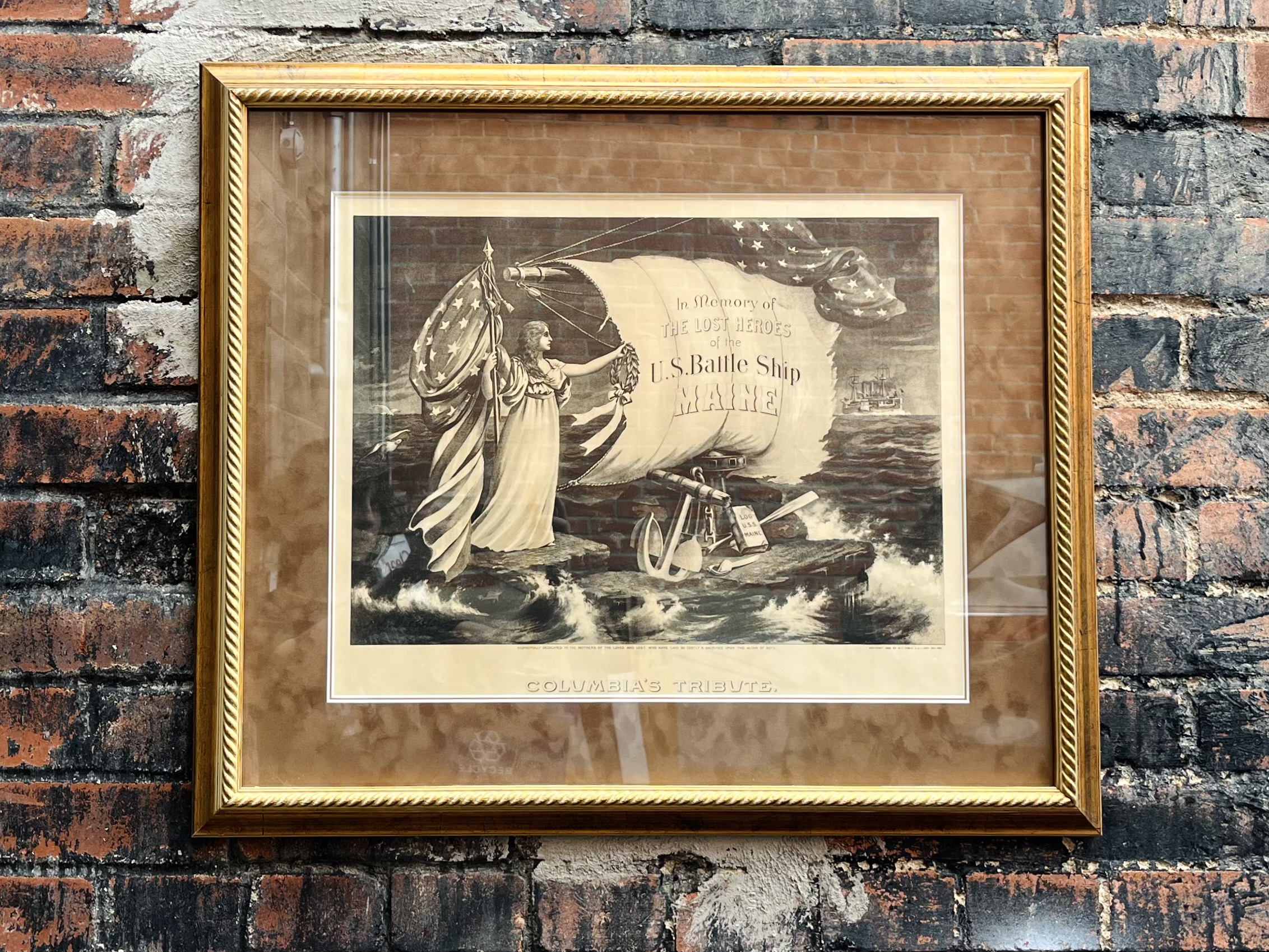 Framed artwork, “In Memory of the Lost Heroes of the U.S. Battleship Maine, Columbia’s Tribute.”