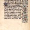 This is an original leaf from a medieval manuscript Book of Hours. The text consists of 14 lines of text (ruled in red of 16), written in French with dark brown ink in gothic script on animal vellum. The one two-line initial is burnished in gold, on blue and red ground, with delicate white tracery. The panel border contains an intricate ivy-leaf design with flowers and berries (including strawberries – the symbol of perfect righteousness) in gold, blue, red, orange and green. Verso blank. The illuminated initial B” concludes the Seven Requests to Our Lord: “Biau sire Dieu?” This highly popular Medieval prayer seeks God’s pity by reminding him of those times or of those people upon which he bestowed his kindness.Book of Hours are personal prayerbooks of a devout and status-conscious society and are not only works of art, but cultural documents of their time. They reveal a unique combination of sacred and secular imagery – made of the finest materials, by the best craftsmen, for a small audience that could both appreciate and afford them.