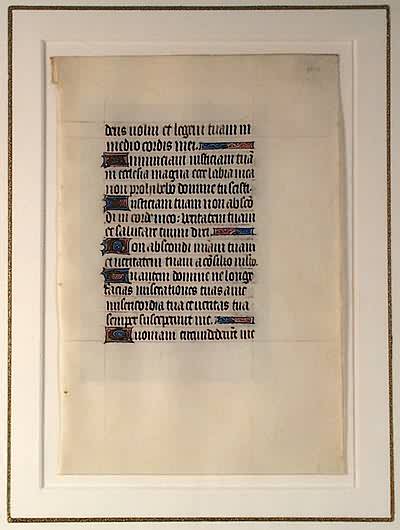 Original leaf from a late-medieval manuscript Book of Hours. 16 lines or red-ruled Latin text, with dark brown ink in Gothic textura script on animal vellum. Nine one-line initials and seven line-extenders in gold on blue and mauve ground with delicate white tracery.The one-line illuminated A” begins Psalm 39:10-15: “Adnuntiavi?”(I have declared thy justice in a great church, lo, I will not restrain my lips?Thou art my helper and my protector: O my God, be not slack).Book of Hours are personal prayer books of a devout and status-conscious society and are not only works or art, but also cultural documents of their time. They reveal a unique combination of sacred and secular imagery – made of the finest materials, by the best craftsmen, for a small audience that could both appreciate and afford them.