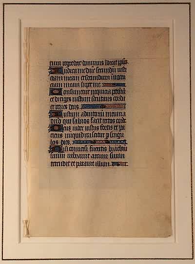 Original leaf from a late-medieval manuscript Book of Hours. 16 lines or red-ruled Latin text, with dark brown ink in Gothic textura script on animal vellum. Ten one-line initials and six line extenders in gold on blue and mauve ground with delicate white tracery.The one-line illuminated I” begins Psalm 7:9-18: “Iudica me?” (Judge me, O Lord, according to my justice, and according to my innocence?I will give glory to the Lord according to his justice: and will sing to the name of the Lord the most high).Book of Hours are personal prayer books of a devout and status-conscious society and are not only works of art, but also cultural documents of their time. They reveal a unique combination or sacred and secular imagery – made of the finest materials, by the best craftsmen, for a small audience, which could both appreciate and afford them.