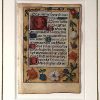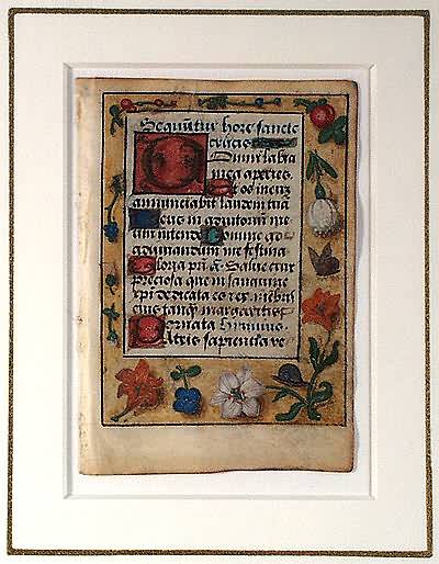 Original leaf from a Renaissance manuscript Book of Hours (105x73mm). 15 lines of text, written in Latin with dark brown ink and blue ink (which is highly unusual) on animal vellum. One four-line, two two-line, and four one-line illuminated initials in gold/silver on red/blue or green ground. The text is surrounded with an exceptional inhabited trompe l’oeil floral border. (containing a butterfly – the symbol of Resurrection, snail, strawberry – symbol of perfect righteousness, and lilies – symbol of purity) showing the influence of Simon Bening. Netherlands, c. 1500.