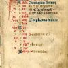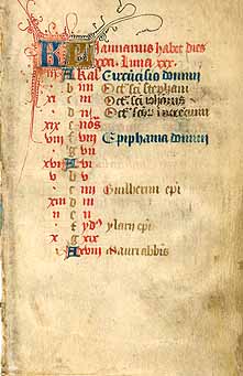 17 lines of text (recto) in a gothic lithurgical hand upon lines ruled in purple ink, with at least one illuminated letter in burnished gold. Calendar entries and verse initials in red and blue. This leaf is from a calendar, which preceded other texts in the Medieval devotional known as a Book of Hours.KL” is the abbreviation for the Greek word for calendar.