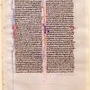A lovely original leaf from a medieval manuscript pocket Bible, written in Paris c. 1240-50. In Latin gothic micro-minuscule script, ruled in red and written in brown ink in two columns of 44 lines on animal vellum. Rubricated chapter numbers, four multi-lined illuminated Lombard style initials & elegant marginalia red & blue. The gothic text is written in extremely tiny & very well formed letters, so small that there are twelve lines of text to the inch! The back (verso) contains two scribal omissions added in the margins – these omissions were to be inserted in the text & are surrounded by a red box indicating the transcription had been systematically checked for accuracy” (DeHamel, “Scribes & Illuminators,” p. 43) The book from which this leaf came was a very high-quality production, scribed in the Johannes Grusch Workshop in Paris. The calligraphy is excellent, and the vellum is of the finest style, extremely thin and very white.