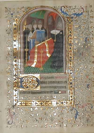 Original leaf from a medieval manuscript Book of Hours. 15 lines of ruled gothic textura script, written in Latin with dark brown ink, on animal vellum. Rubrics (headings) in red. Three-quarter page illuminated paintig of a funeral service. One four-line illuminated initial with floral infill; six illuminated one-line initials and three line-extenders in gold on red and blue ground with white tracery. Panel border of vines and flowers in gold, blue, red and green. This Rinceaux border is in the style of Boucic Master Atelier. This leaf is from Northern France and is dated around 1420-40. The illuminated initial D” opens the Hours of Vespers with Psalm 114:1-7: “Dilexi quoniam” ( I have loved, because the lord will hear the voice of my prayer…).Book of Hours are personal prayer books of a devout and status-conscious society and are not only works of art, but cultural documents of their time. They reveal a unique combination of sacred and secular imagery-made of the finest materials, by the best craftsmen, for a small audience, which could both appreciate and afford them.
