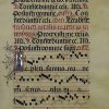 This is an original leaf from a 15th century Gregorian chant. This musical sheet was executed by hand in manuscript calligraphy on animal parchment. The music and text (six lines written in rounded gothic script) are written in black ink, on a five-line-stave, with headings and rubrics in red. This leaf is related to a series of choirbooks attributed to the Master of the Cypresses (Pedro da Toledo?) who illuminated 20 Choirbooks now in the Cathedral of Seville. The two illuminated initials extend the length of the five-line stave and are in burnished gold with an interior floral motif on blue ground, resting on an outer rectangular red ground with a delicate floral motif; then extending into the margin in an elegant rinceaux-style border of vines adorned with gold bezants! One calligraphic initial heightened with yellow. The illuminated R” begins Psalm 89:14: “Repleti?” ( We are filled in the morning with thy mercy: and we have rejoiced. Alleluia). The illuminated “E” begins John 15:5: ” Ego sum?” ( I am the vine, you are the branches: he that abideth in me, and I in him, the same beareth much fruit).