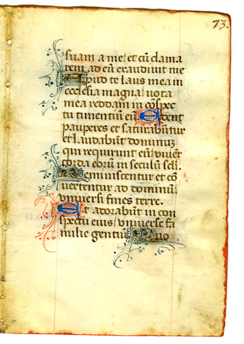 This stunning manuscript leaf on vellum from a French Psalter, was written in Northern France in the late 15th century. The Psalter is written in Latin in a Gothic script with brown ink and burnished gold initials with alternating blue, red, or white tracery and infill. The term Psalter is used to describe a volume containing the 150 biblical poems know as the Book of Psalms, used for liturgical use and which often contain other devotional material. The Psalms (derived from the Greek word psalmos, meaning song”) are short, lyrical passages written in the first person. Due to their varied content and versatility, individual psalms are often employed as prayers, both in public worship and in private devotion. A beautiful archival mat has been added with windows cut front and back for easy viewing of both sides. This is a rare opportunity to purchase a 500 year old biblical document. This Psalter leaf is part of Psalm 22.25 Let all the seed of Israel fear him: because he hath not slighted nor despised the supplication of the poor man. Neither hath he turned away his face from me: and when I cried to him he heard me. (partial) 26 With thee is my praise in a great church: I will pay my vows in the sight of them that fear him. 27 The poor shall eat and shall be filled: and they shall praise the Lord that seek him: their hearts shall live for ever and ever. 28 All the ends of the earth shall remember, and shall be converted to the Lord: And all the kindreds of the Gentiles shall adore in his sight. 29 For the kingdom is the Lord’s; and he shall have dominion over the nations. (partial)” “