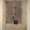 Original leaf from a medieval manuscript Missal. Two columns (29 lines each) of Latin text, written in rotunda script in black and red ink on animal parchment. Five two-line initials alternately in blue and red with the extensive fine pen-scroll tracery in blue or ed extending to the margins. Numerous one-line initials alternating in red and blue. One exceptional illuminated four-line initial in pink, yellow and green with an interior of red, orange and blue on a square gold ground, extending into the margin with a floral motif in red, orange, green and gold.The two-line I” (recto) notes the beginning of John 21:20-24 “In?Conversus Petrus?” (Peter turning about, saw that disciple whom Jesus loved following, who also leaned on his breast at supper, and said: Lord, who is he that shall betray thee?). The two-line “I” (verso) note the beginning of Apocalypse (Revelation) 14:1-5: “In?Vidi supra montem?” (And I beheld, and lo a lamb stood upon mount Sion, and with him an hundred forty-four thousand, having his name, and his Father, written on their foreheads?)”