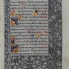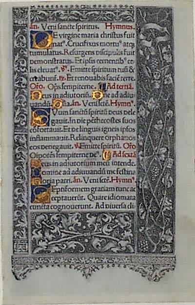 This is an original leaf from an important printed hand-illuminated Book of Hours. Ruled Latin text, printed in red & black on animal vellum. Initials, paragraph markers & endings illuminated by hand in gold, on grounds of blue and or magenta. Noted for its Decorative Borders – the paneled surrounds are historiated or inhabited. Printed by Thielma Kerver, in Paris, ca 1506. Ex collection: Baron Alexander Peckover von Wisbech. This leaf is for the Hours of the Holy Spirit, Hours of Terce, Sext, None & Vespers. Books of Hours are personal prayer books of a devout and status-conscious society and are not only works of art, but cultural documents of their time. They reveal a unique combination of sacred and secular imagery-made of the finest materials, by the best craftsmen, for a small audience that could both appreciate and afford them. In purpose & format, printed Book of Hours followed the older manuscript examples. The more luxurious were printed on vellum, as is this specimen.