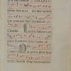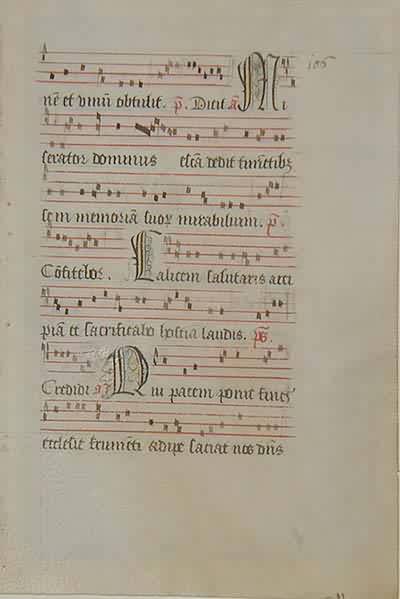 Original leaf from Flemish antiphonalon animal vellum. From the antiphonal of Marguerie De Bacovel; Completed for her by Lois de Villechecq, Vicar of the nunnery and a Carthusian monk. Provenance: Ex John Carter Brown Library.The manuscript text and music (seven lines ona four-line stave) were beautifully executed by hand in black ink with headings, rubrics and rulings in red. The large intriguing calligraphic initials include a humorous face and are colored with wash.The large calligraphic initial M” is from Psalm 110:4-5: “Miserator Dominus… ( The merciful Lord hath given food to them that fear him..) The large calligraphical initial “C” is from Psalm 115:14: “Calicem salutarius… ( I will take the chalice of salvation).