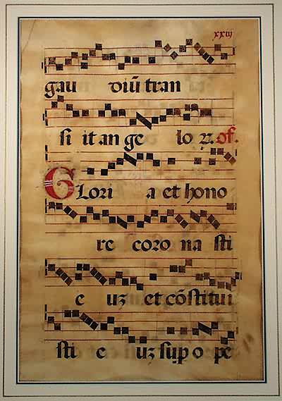 Original leaf from an Italian antiphonal on animal parchment. From an Antiphonal attributed to the Dominican Order of St. Mary Magdalene in Quirnal, Rome, c. 1606. The manuscript text and music (six lines on a four-line stave) were beautifully executed by hand in black ink with headings, rubrics and rulings in red. One large illuminated initial in the shape of a dragon-like creature, in colors or red, white, silver, and gold. The large illuminated initial G” is from the Psalm 8:6-7: “Gloria at honore?” (thou hast crowned him with glory and honour and hast set him over the works of thy hands).Antiphonals contain chants for the canonical hours of the Devine office: first vespers or the vigil of great feasts, matins, lauds, prime, terce, sext, none, vespers, and compline.