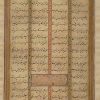 This is an original manuscript leaf from an illuminated manuscript of the Shanama or Book of Kings – one of the most famous of all Persian manuscripts. Very fine calligraphy, in four columns of Persian Nastaliq script on polished paper, sprinkled with gold. Margins ruled in blue, orange, red and gold, with column bars in a floral motif on gold ground. Headings are in white surrounded by flowers on a gold ground. (Ref: Soudaver, Art of the Persian Court).