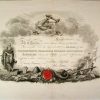 This document has the remains of the red, wax seal in the center. The background has beautiful engravings of a statue of Archimedes, cornucopia, and a ship sailing in with a Massachusetts flag. This document officially commemorates the admittance of Adna Bates of Boston as a member of the Massachusetts Charitable Mechanic Association on March 18, 1819.