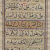 This is an original manuscript leaf from a late 17th- early 18th cenury book of prayer and religious quotations. Written on native polished paper in naskhi script ( the parent of modern Arabic writing), with diacritics in black, and illuminated gold discs decorated with red dots. Margins ruled in blue, red and gold. The leaf is divided with three bars of script on a tan wash and two sections of three lines of script on plain background. Some worming is evident.