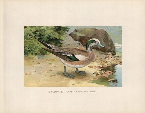 This beautiful chromolithograph was published by the Commissioners of the Fisheries, Game, and Forests of the State of New York. This representation of the Baldpate was noted as inhabiting the State of New York in 1905. J.L. Ridgeway was the artist and his signature appears on the image.