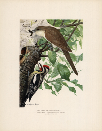 This beautiful chromolithograph was published by the Commissioners of the Fisheries, Game, and Forests of the State of New York. This representation of the Black-Billed Cuckoo and Yellow-Bellied Sapsucker were noted as inhabiting the State of New York in 1905. Louis Agassiz Fuertes was the artist and his signature appears on the image.