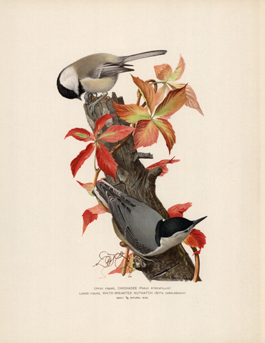 This beautiful chromolithograph was published by the Commissioners of the Fisheries, Game, and Forests of the State of New York. This representation of the Chickadee (Parus Atricapillus) and White-Breasted Nuthatch (Sitta Carolinensis) were noted as inhabiting the State of New York in 1905. Louis Agassiz Fuertes was the artist and his signature appears on the image.