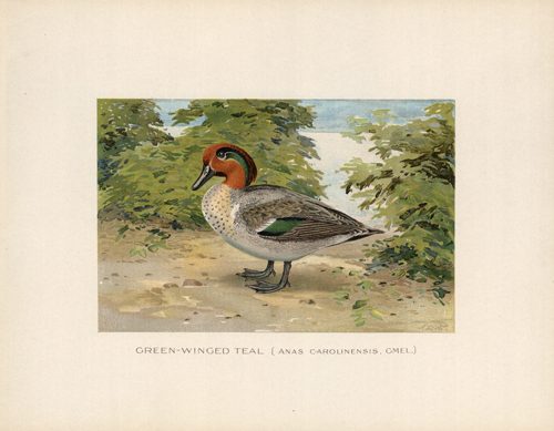 This beautiful chromolithograph was published by the Commissioners of the Fisheries, Game, and Forests of the State of New York. This representation of the Green-Winged Teal was noted as inhabiting the State of New York in 1905. J.L. Ridgeway was the artist and his signature appears on the image.