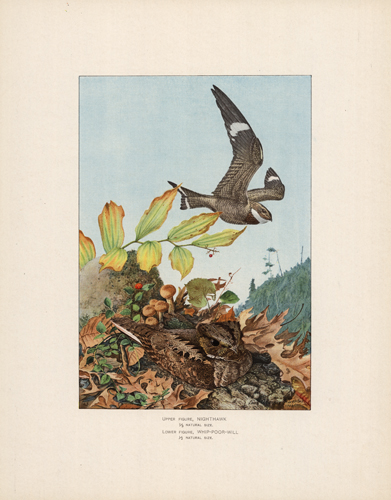 This beautiful chromolithograph was published by the Commissioners of the Fisheries, Game, and Forests of the State of New York. This representation of the Nighthawk, and Whip-Poor-Will were noted as inhabiting the State of New York in 1905. Louis Agassiz Fuertes was the artist and his signature appears on the image.