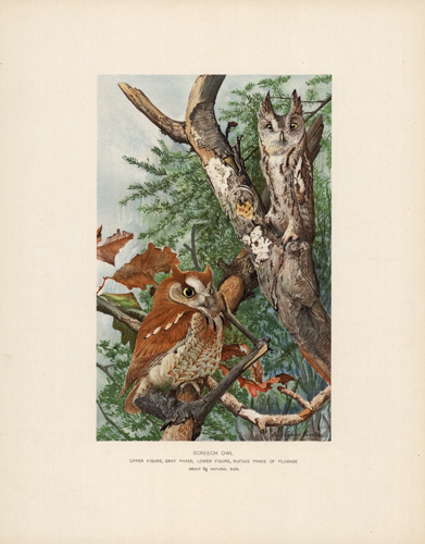 This beautiful chromolithograph was published by the Commissioners of the Fisheries, Game, and Forests of the State of New York. This representation of the Screech Owl was noted as inhabiting the State of New York in 1905. Louis Agassiz Fuertes was the artist and his signature appears on the image.