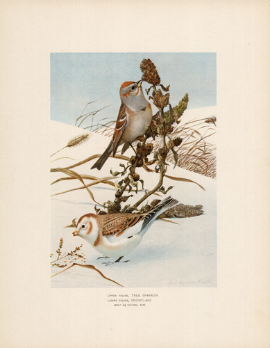 This beautiful chromolithograph was published by the Commissioners of the Fisheries, Game, and Forests of the State of New York. This representation of the Tree Sparrow and Snowflake were noted as inhabiting the State of New York in 1905. Louis Agassiz Fuertes was the artist and his signature appears on the image.